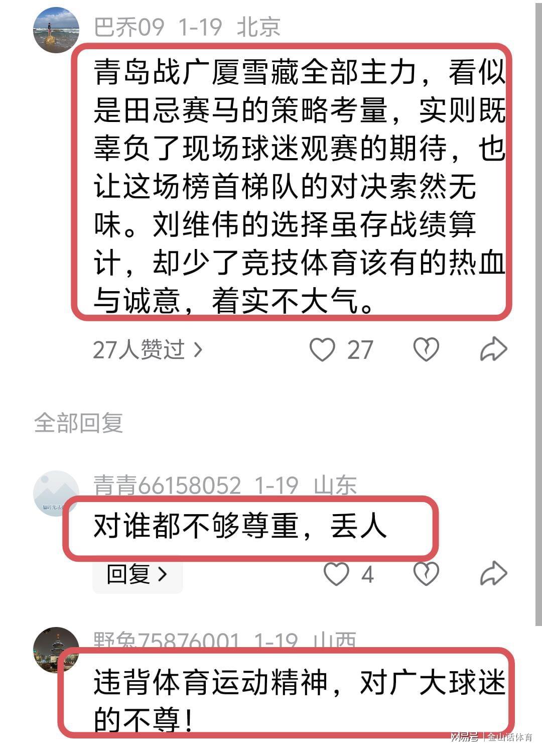 青岛队在央视直播的比赛中,“下架”4大主力,也让广大网友非常气愤,纷纷吐槽道:“刘维伟直接轮休4个绝对主力,太不像话了,体育的意义在哪里?体育的精神在哪里?”;“青岛战广厦雪藏全部主力,看似是田忌赛马的策略考量,实则既辜负了现场球迷观赛的期待,也让这场榜首梯队的对决索然无味。刘维伟的选择虽存战绩算计,却少了竞技体育该有的热血与诚意,着实不大气。”;“对谁都不够尊重,丢人”;“违背体育运动精神,对广大球迷的不尊!”;“直接缴枪,篮协应该有态度。……